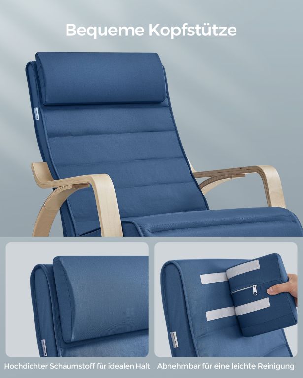 Nowoczesny fotel bujany z regulowanym podnóżkiem, niebieski