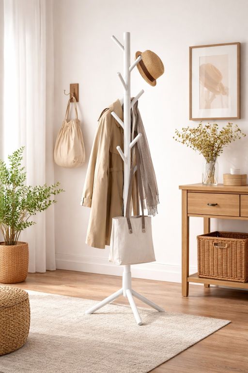 Dodaj elegancji i funkcjonalności swojemu wnętrzu dzięki temu beżowemu wieszakowi stojącemu. Minimalistyczny styl sprawia, że pasuje do każdego pomieszczenia, a praktyczne haczyki pomieszczą ubrania całej rodziny. To idealny wybór dla osób ceniących porządek i estetykę.