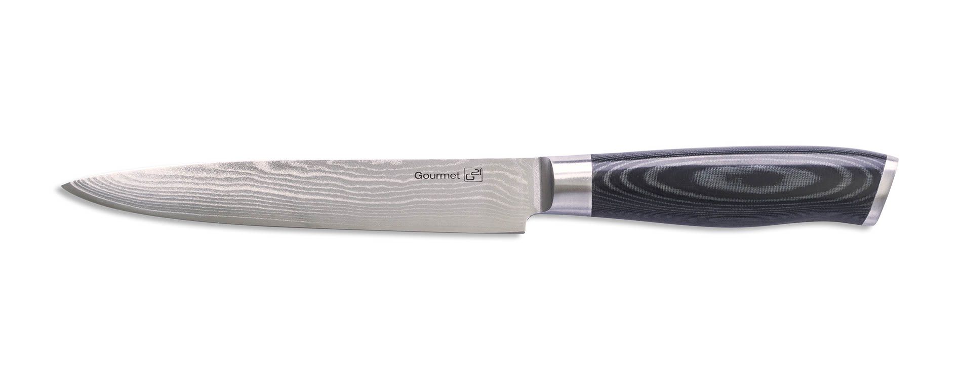 Wysokiej jakości 18 cm nóż kuchenny G21 Gourmet Damascus wykonany z japońskiej stali damasceńskiej tnie i porcjuje. To sprawia przyjemność codziennego gotowania, co docenia każdy dobry kucharz.