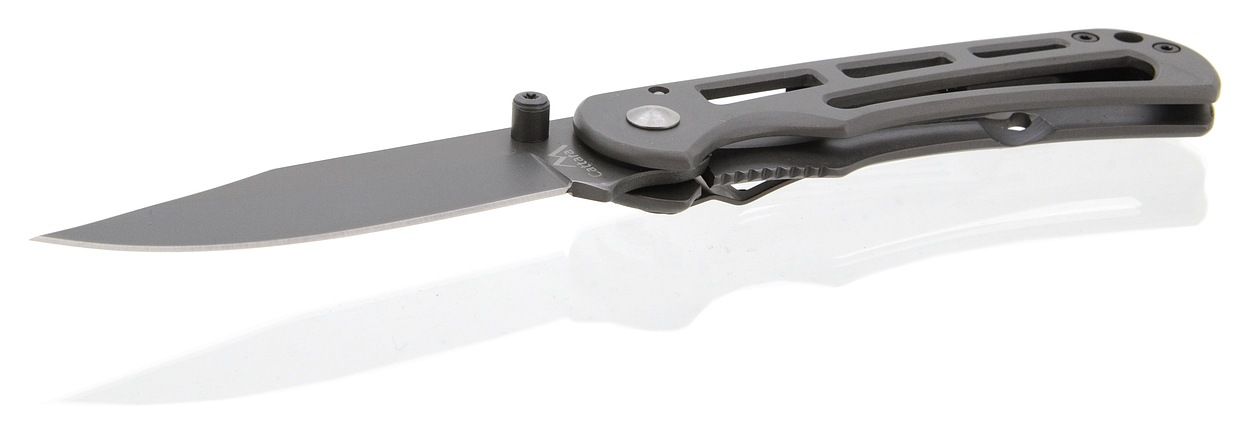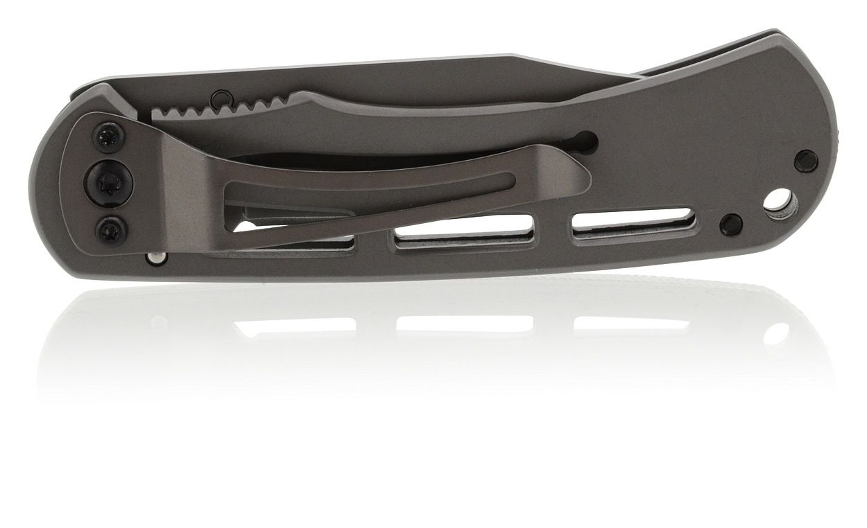 Uchwyt z atrakcyjną perforacją obu uchwytów, wyposażony w klips z tyłu do mocowania do krawędzi kieszeni, paska itp. Uchwyty wykonane są ze stali tnącej 420J1 pokrytej tytanem.