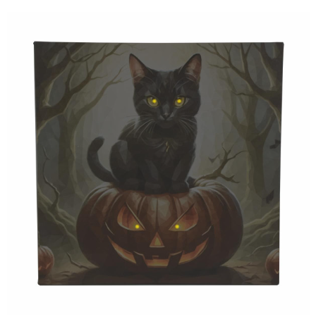 Ukazać szczegółowy opisNastrojowy obraz LED z kotem na dyni, idealny na Halloween do salonu lub sypialni.