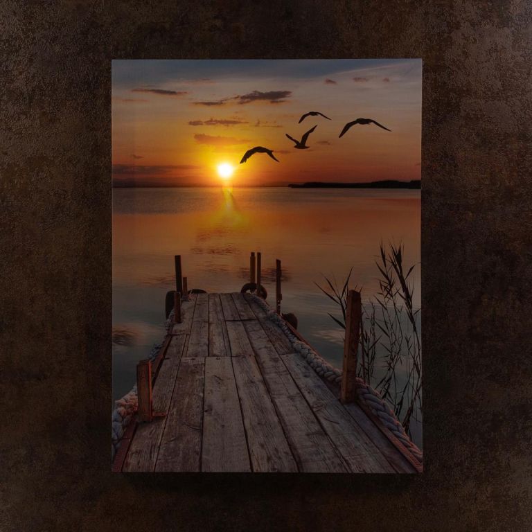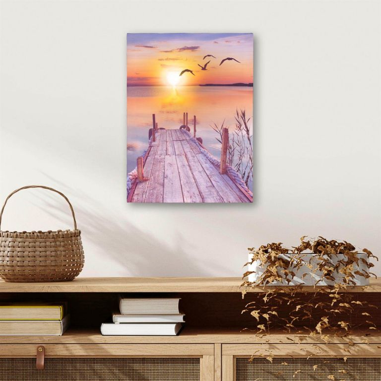 Stwórz przytulną atmosferę dzięki podświetlanym obrazom LED. Malowniczy zachód słońca nad jeziorem zapewni przyjemny nastrój i przytulną atmosferę w Twoim salonie. Ciepła biała dioda LED w strefie słońca wyczarowuje obraz w czarującym blasku i tworzy odpowiedni nastrój. Dekoracyjne obrazy wydrukowane nowoczesnymi, wysokiej jakości odbitkami fotograficznymi zawsze podkreślają każde pomieszczenie i rozjaśniają jego otoczenie. Dzięki zasilaniu bateryjnemu nie masz irytującego kabla i możesz zawiesić lekki obraz w dowolnym miejscu. Tylna część jest gotowa do zawieszenia.