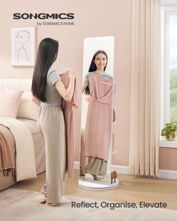 Obrotowe lustro z półkami i haczykami – styl i funkcjonalność do każdego wnętrza.