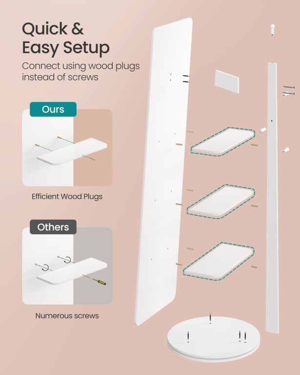 Odkryj połączenie stylu i funkcjonalności w jednym produkcie. To wysokie lustro o minimalistycznym designie i śnieżnobiałym kolorze doskonale uzupełni sypialnię, przedpokój czy garderobę. Wszystko, czego potrzebujesz, masz zawsze pod ręką dzięki 4 półkom i 4 haczykom z tyłu. Obrotowy mechanizm zapewnia łatwy dostęp do przechowywanych rzeczy i pozwala cieszyć się pełnym widokiem stylizacji.