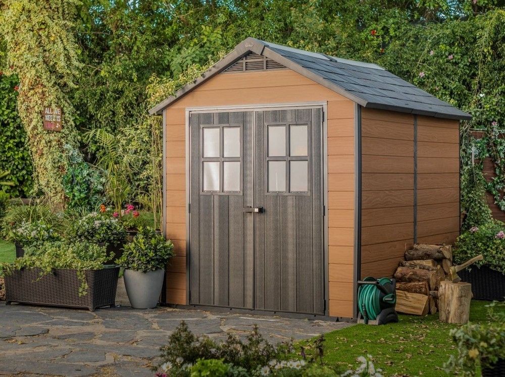 Ten wytrzymały domek ogrodowy jest wykonany z unikalnego materiału EVOTECH (drewno-plastik) i ma wysokiej jakości konstrukcję dwuścienną.