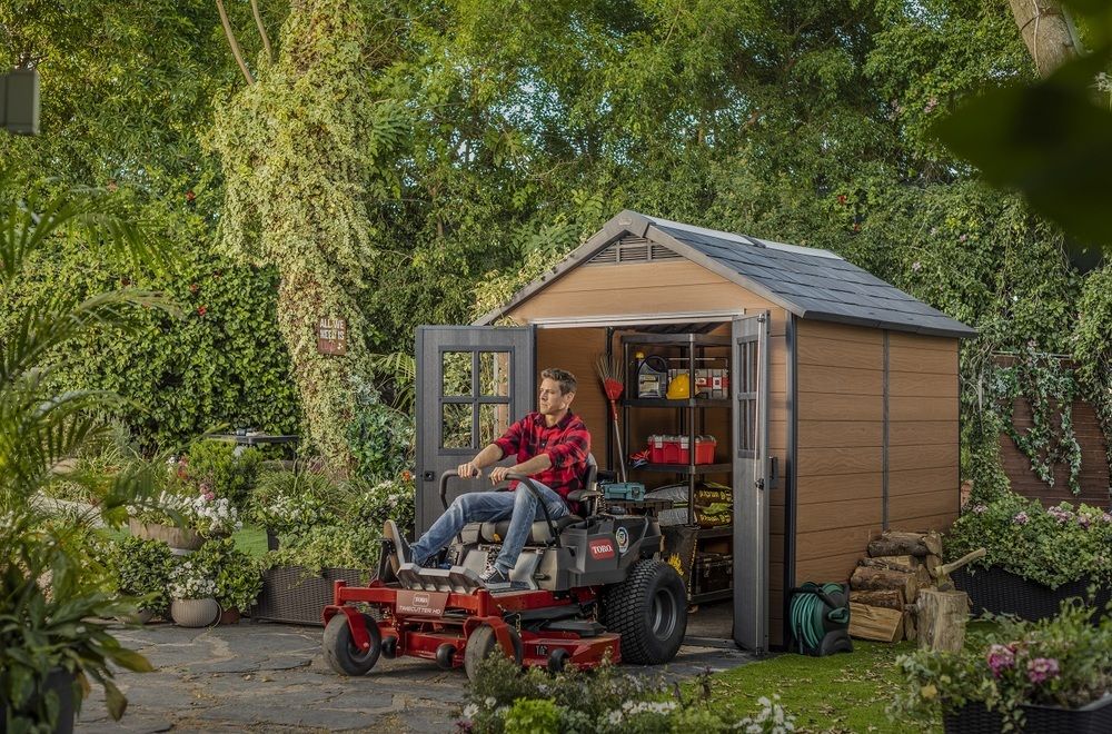 Domek ogrodowy jest wyposażony w solidny dach, szerokie podwójne drzwi i podłogę do wymagających zastosowań. NEWTON łączy nowoczesne i drewniane elementy z wysoką odpornością na warunki atmosferyczne.