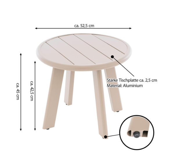 Ten poręczny okrągły stół aluminiowy jest idealny do przechowywania napojów i żywności w ogrodzie lub oranżerii, na balkonie lub tarasie. Aluminiowy stół jest bardzo stabilny i ma przestronną powierzchnię. Plansza jest podzielona na 5 atrakcyjnych segmentów. Rama z szerokimi nogami zapewnia dobrą stabilność. Ten stół jest również odporny na warunki atmosferyczne i łatwy w utrzymaniu.