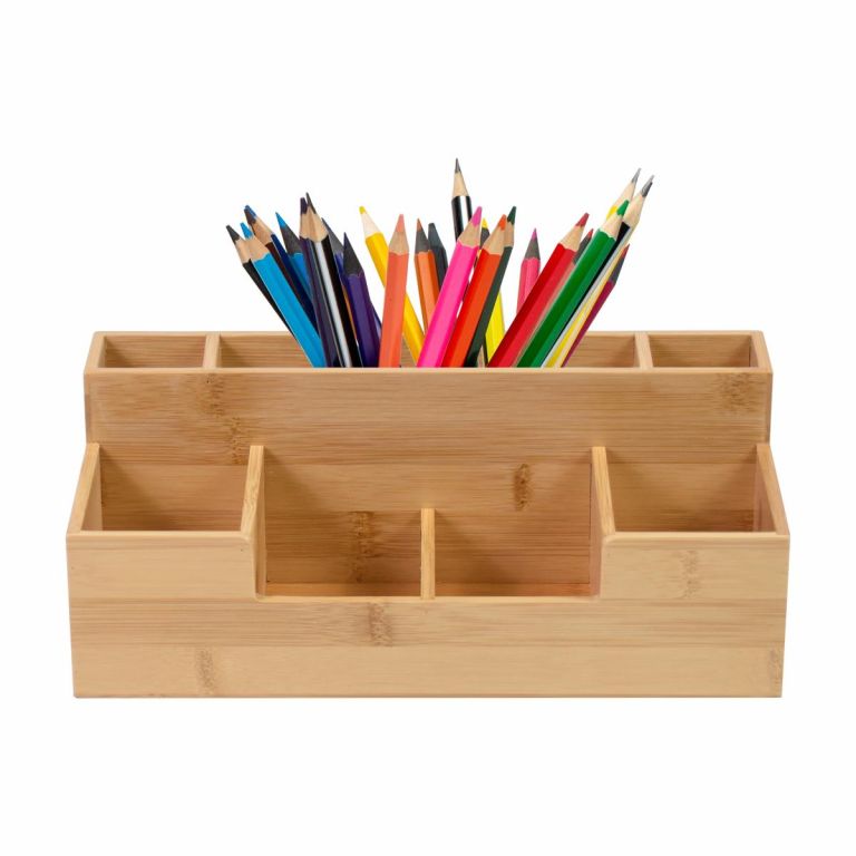 Organizator jest wszechstronny, można go wykorzystać na przykład w kuchni lub łazience. Siedem przegródek oferuje miejsce na długopisy, linijki, karteczki samoprzylepne, koperty, spinacze biurowe, klej, nożyczki, temperówki i wiele innych. Odkryj w naszym sklepie inne modele z drewna bambusowego!