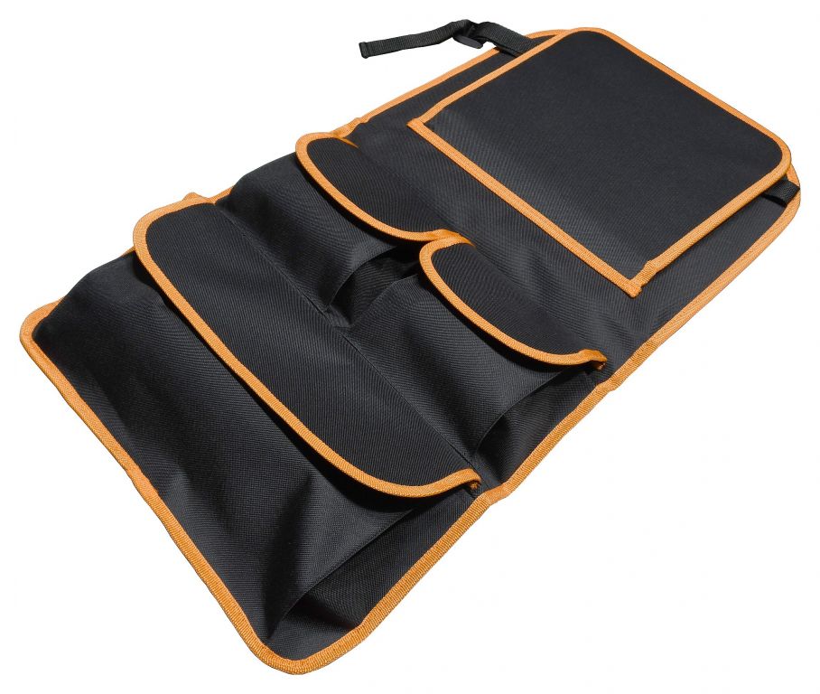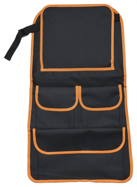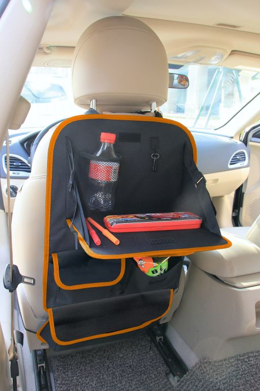Organizer na przednie siedzenie z kieszeniami i praktycznym stolikiem. Posiada 3 kieszenie zapinane na rzep oraz stolik z regulacją nachylenia, za pomocą pasków. Stół zabezpieczony jest rzepem przed niezamierzonym otwarciem. Wnętrze wyposażone jest w karabińczyk do zawieszania różnych przedmiotów, a także jest wyposażone w siateczkową kieszeń do picia w puszkach lub plastikowych butelkach. Organizer chroni siedzisko przed zabrudzeniem. Można go łatwo i szybko przymocować do oparcia przedniego fotela samochodu za pomocą regulowanego paska z klipsem i sznurkami.
