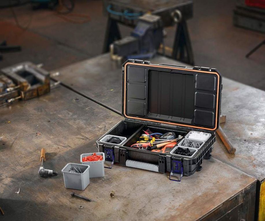 Profesjonalny organizer do przechowywania drobnych części i akcesoriów, wyposażony w wysoce funkcjonalne pudełka. Ma specjalne klamry i boczne ucho, wszystkie wykonane z wysokiej jakości tworzywa sztucznego. Zawiera również gumową uszczelkę.