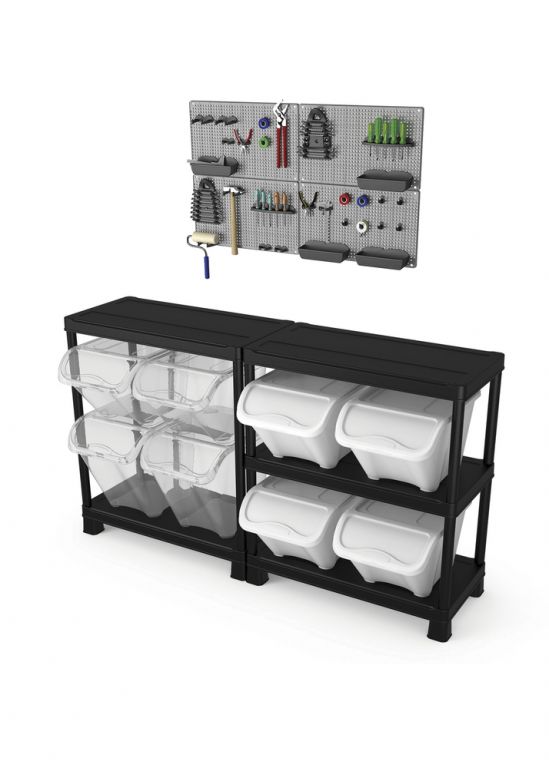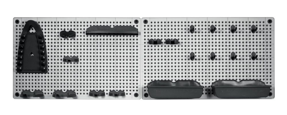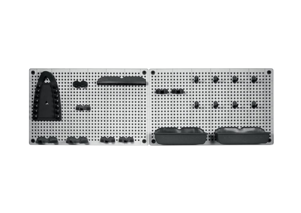 Bardzo praktyczny i stylowy organizer na narzędzia wykonany z bardzo wytrzymałego tworzywa sztucznego. Organizer jest po prostu mocowany bezpośrednio do ściany, idealnie nadaje się do aranżacji wszystkich narzędzi warsztatowych, które musisz mieć zawsze pod ręką. Regulacja pozioma lub pionowa. W pakiecie 2 x tablica organizacyjna i duża ilość akcesoriów.