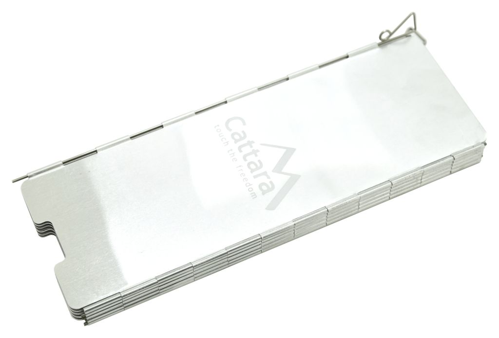 Praktyczne osłony przeciwwiatrowe, idealne do kuchenek gazowych. Osłona składa się z aluminiowych płyt, połączonych w taki sposób, że można ją w pełni dopasować do warunków użycia, chroniąc płomień kuchenki przed wiatrem. Osłonę można łatwo i szybko złożyć i umieścić w dołączonym pokrowcu.