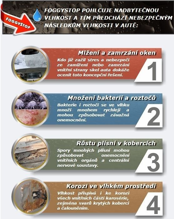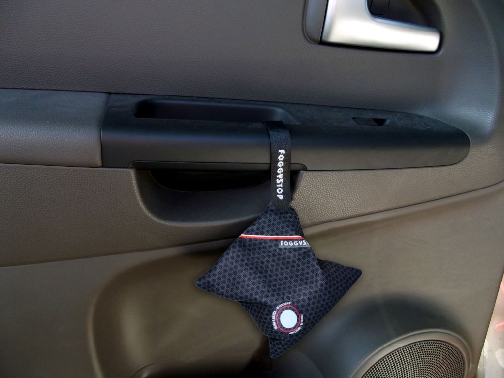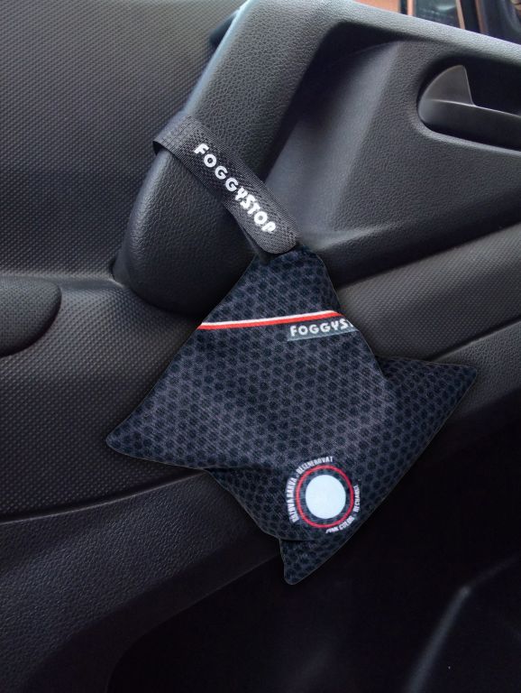 Produkt wyposażony we wskaźnik kolorymetryczny wilgotności, pochłania zapachy powstałe głównie w wyniku palenia lub transportu psów. Zmniejsza ryzyko korozji spoin nadwozia, zwłaszcza podłogi. Ponadto produkt można wysuszyć w ciągu 2 minut i ponownie użyć do 100 razy przez 3 lata. To koncepcyjne rozwiązanie może docenić każdy, kto już doświadczył stresu i niebezpieczeństwa zaparowania lub zamarznięcia szyby samochodu. Znacząco zwiększa bezpieczeństwo jazdy w samochodzie. Produkt przeszedł również pomyślnie testy w ekstremalnych warunkach austriackich Alp. Koło wskaźnika zmienia kolor w zależności od stopnia zwilżenia zawartości. Całkowicie wysuszony Foggystop PLUS jest oznaczony niebieskim kolorem, który zmienia się z białego na różowy wraz ze wzrostem wilgotności. Pełne białe lub różowe kółko wskazuje na potrzebę regeneracji.