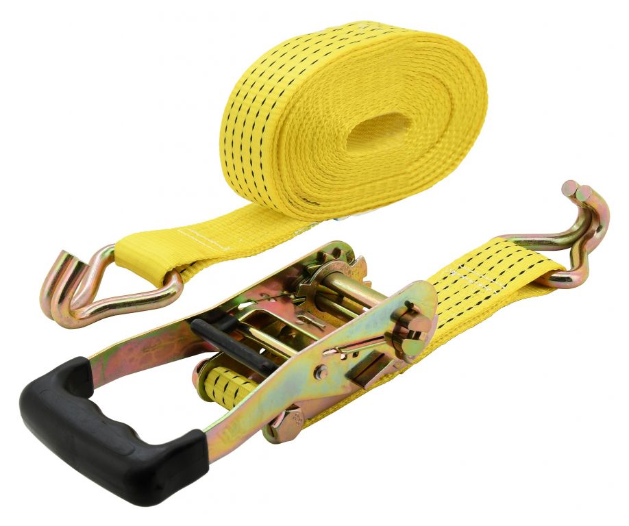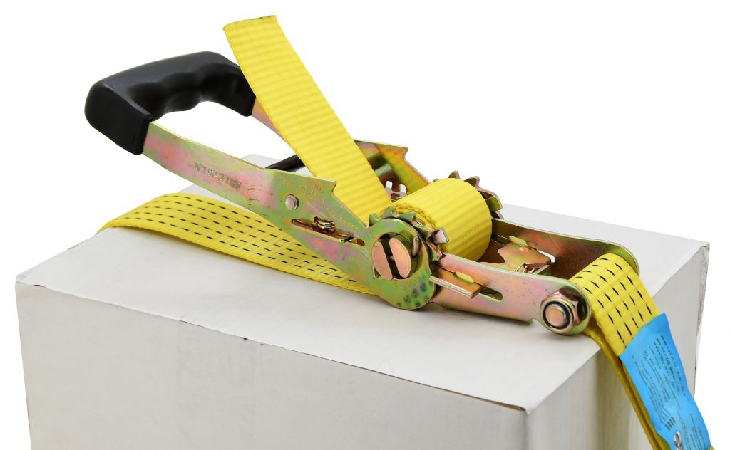 Zaciskowy pasek z grzechotką z metalowymi haczykami, z atestem TÜV / GS, do zabezpieczania ciężkich ładunków. Grzechotka to całkowicie metalowa konstrukcja z trwałym mechanizmem zabezpieczającym, wyposażona w plastikowy uchwyt zapewniający wygodną obsługę. Taśma o szerokości 50 mm i długości 8 m charakteryzuje się wytrzymałością na rozciąganie 5000 kg (po okrążeniu ładunku). Do mocowania ładunku zalecamy stosowanie plastikowych narożników lub tulei ochronnych. Bez użycia ochronnych rękawów lub narożników wytrzymałość pasów jest zmniejszona i zużycie.