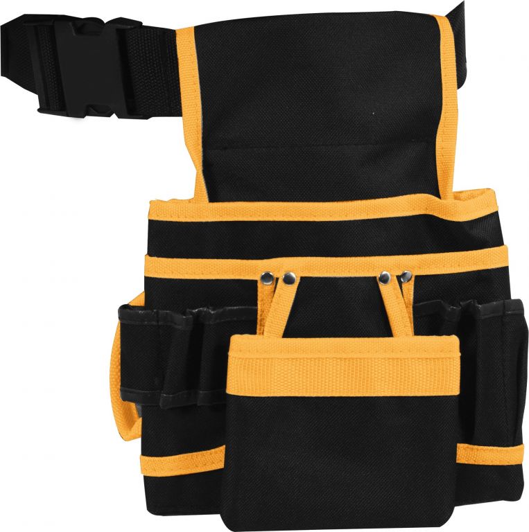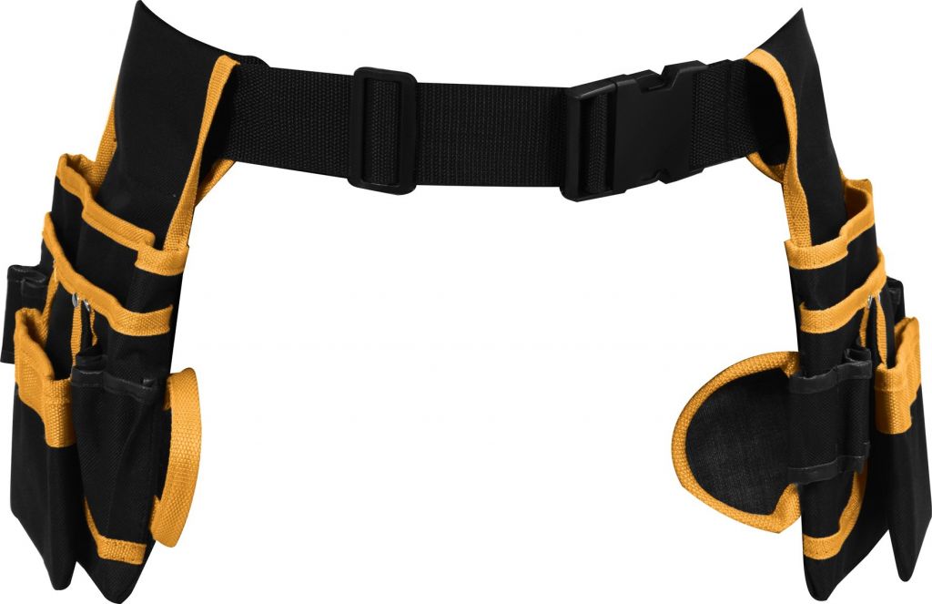 Pas narzędziowy z dwiema przesuwanymi platformami z łącznie 6 kieszeniami i szlufką na młotek. Wykonany z nylonu 600D ze szwami wzmocnionymi metalowymi nitami. Długość pasa można regulować za pomocą sprzączki.