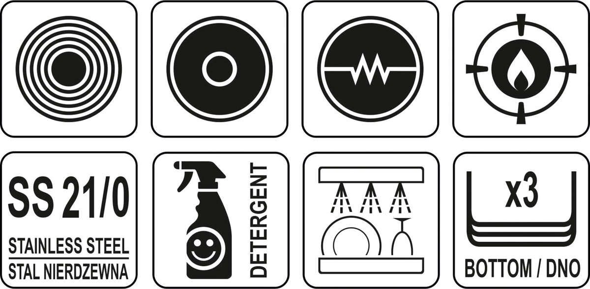 Patelnia jest wykonana z wysokiej jakości stali nierdzewnej 21/0, opracowanej specjalnie do użytku w gastronomii.