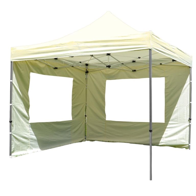 Pawilon ogrodowy rozkładany 3 x 3 m - champagne- w tym ścianki boczne z oknami do całkowitego zamknięcia. Pawilon rozkładany jest automatycznie co zapewni wygodę. Sprawdzi się on nie tylko na większe uroczystości na dworze, ale również jako miejsce gdzie możesz odpoczywać na co dzień! Zachwyca prostotą i elegancją, jest atrakcją każdego ogrodu. Teleskopowe nogi wykończone stopkami które można przytwierdzić do podłoża, ścianki mocowane na rzepy i na haczyki.
