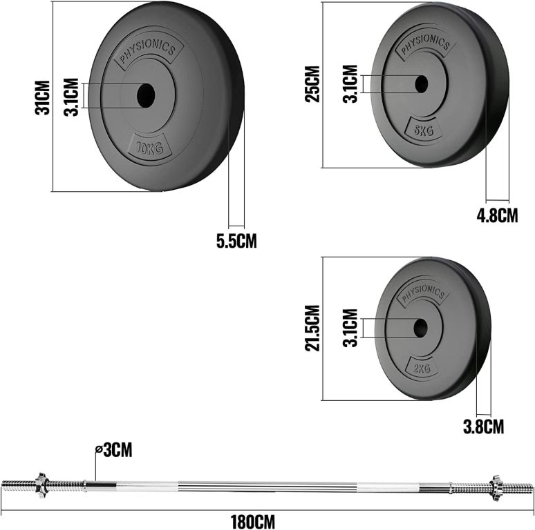 Weź pod uwagę swoje osobiste cele i możliwości i dostosuj ten zestaw do swojego planu treningowego. Dwa miejsca uchwytu o długości 20 cm na sztangi mają antypoślizgową powierzchnię, dzięki czemu ręce nie ześlizgną się z gryfu. Tarcze obciążeniowe są wypełnione cementem i mają trwałą powłokę z tworzywa sztucznego, która nie uszkodzi wykładziny podłogowej.