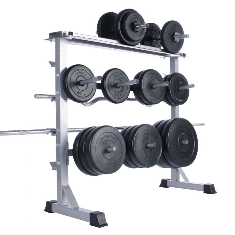 Ten profesjonalny wielopoziomowy stojak na hantle i ciężarki, wykonany z wytrzymałej stali, oferuje dużo miejsca na hantle, poręcze i sztangi. Solidna stalowa rama może udźwignąć do 300 kg i jest bezpiecznym miejscem do przechowywania hantli i obciążników. Antypoślizgowe nóżki zapobiegają niepożądanym ruchom. Stojak posiada różne kątowniki do obciążników i hantli.