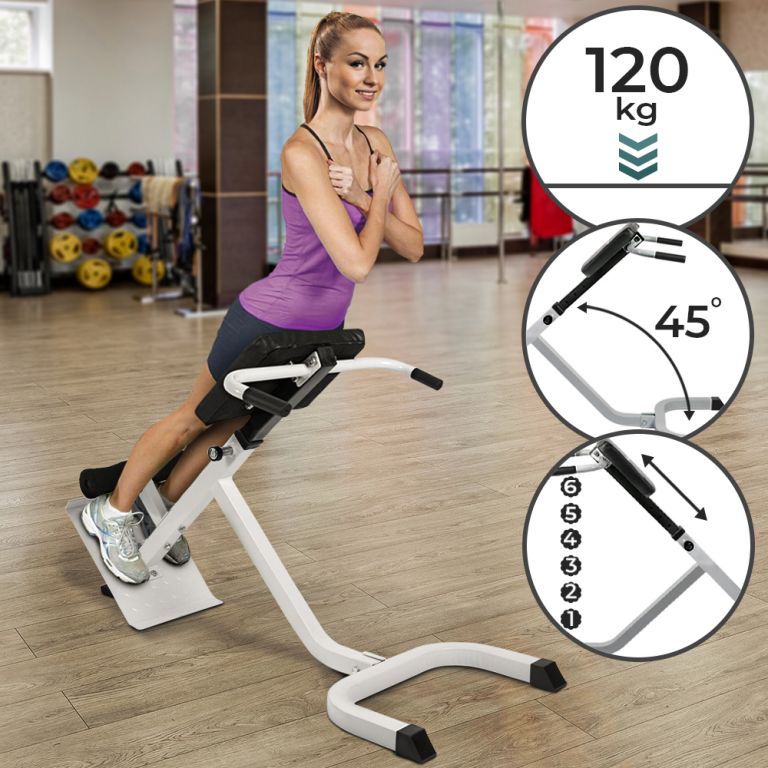 Nasz trenażer ze składanymi plecami pozwala trenować plecy bez konieczności płacenia za siłownię. Jest składany, posiada 6 pozycji regulacji wysokości, ma konstrukcję malowaną proszkowo, a praktyczne uchwyty podtrzymujące zapewniają stabilność. Wyściełane mocowanie nóg z regulacją wysokości, gdzie koła wykonane są z pianki o dużej gęstości. Wyściełana poduszka oparcia z regulacją wysokości w czterech kierunkach. Efektywne ćwiczenia dzięki kątowi 45°.