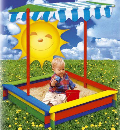 Drewniana piaskownica dla dzieci z baldachimem w kolorze. Dach jest wykonany z nie przemakalnego materiału i jednocześnie służy jako cień przed słońcem. Certyfikat FSC gwarantuje klientom, że drewno, z którego wykonany jest ten przedmiot, pochodzi z lasu, który jest zarządzany w sposób łagodny, zgodnie z zasadami zrównoważonego rozwoju.