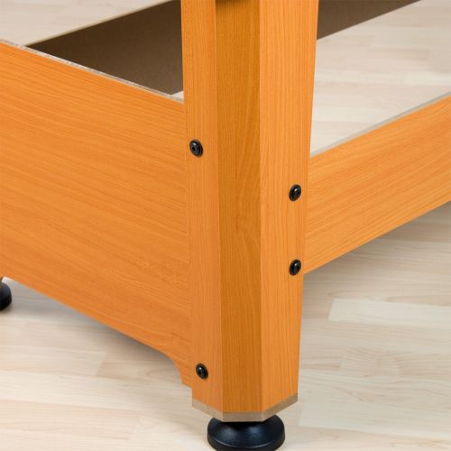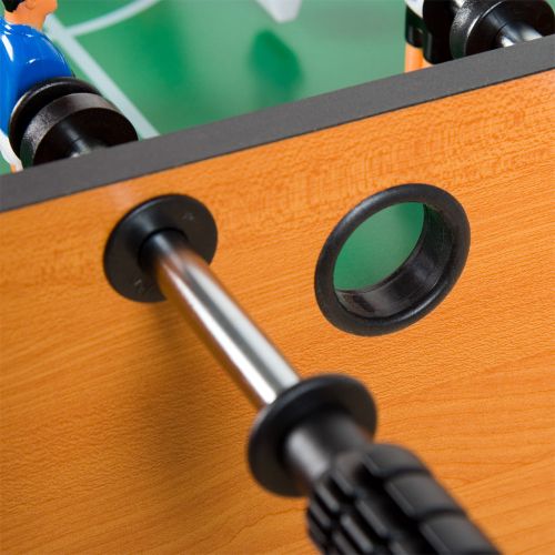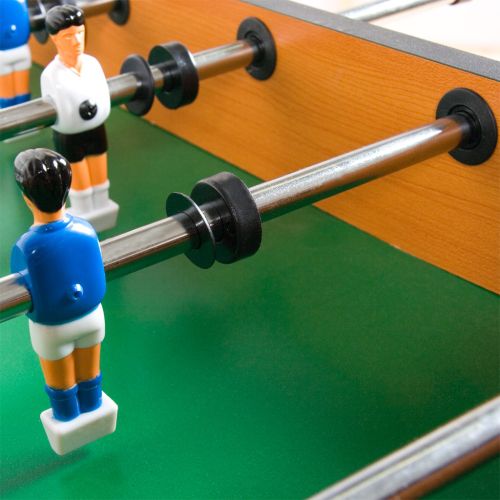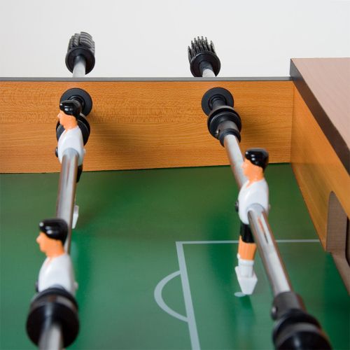 Korpus piłkarzyków wykonany jest z wysokogatunkowegro drewna i wysokiej jakości utwardzanej płyty MDF, pokryty warstwą laminatu - odporny na ścieranie. Otwory z tyłu bramek do wyciągania piłeczki po strzeleniu gola. Jest w pełni stabilny również przy mocnej i intensywnej grze. Produkt charakteryzuje się wysoką dbałością o detale i solidnością. Stabilna kontstrukcja zapewni pewność podczas zabawy. Podwyższone narożniki boiska - aby piłka nie zatrzymywała się w czasie gry.