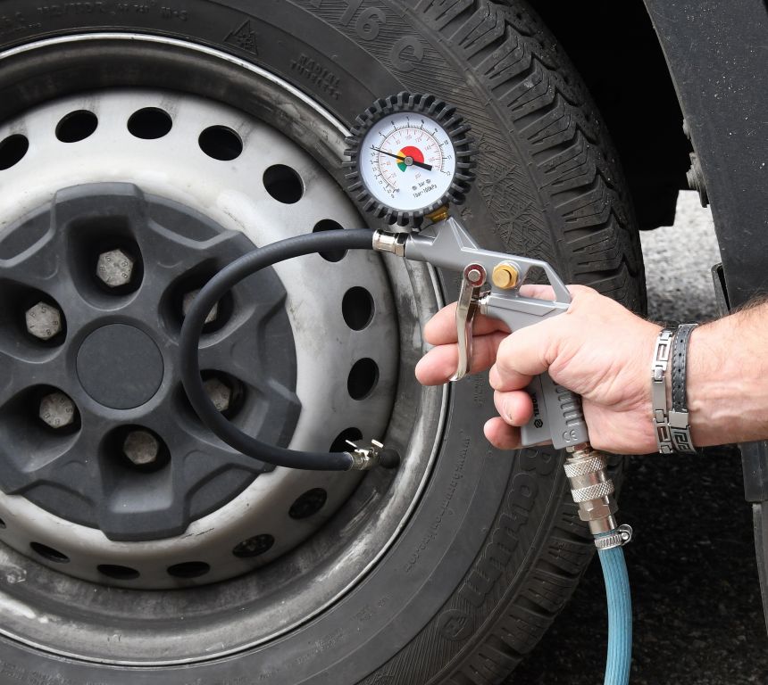 Pistolet pneumatyczny z manometrem do pompowania opon samochodowych z adapterem pasującym do każdej opony samochodowej.