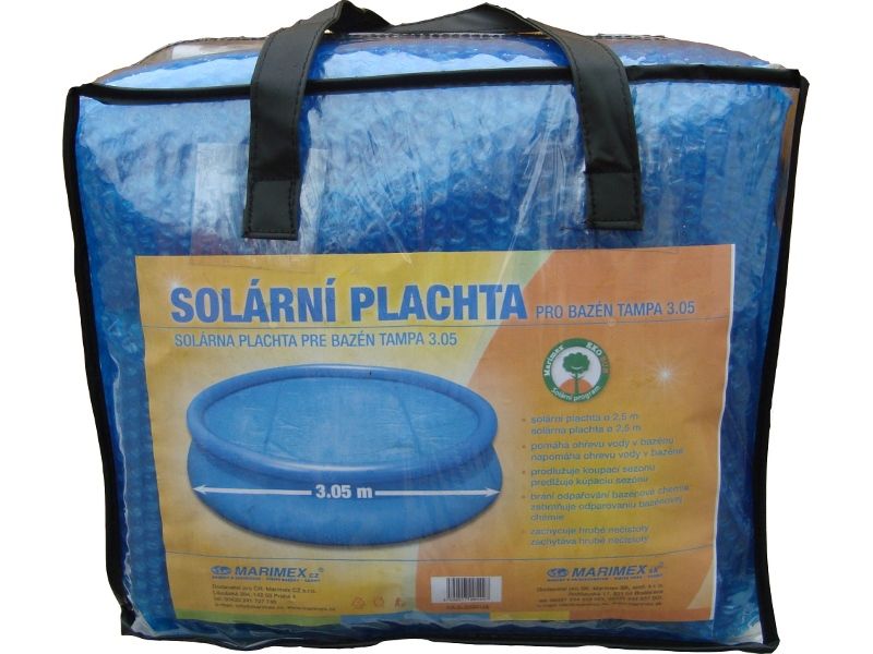 Promienie słoneczne przechodzą przez żagiel słoneczny i podgrzewają wodę bezpośrednio pod powierzchnią. Bąbelki działają jak soczewki w świetle słonecznym, a tym samym podnoszą temperaturę wody. W nocy zapobiegają parowaniu wody, chemikaliów i chłodzeniu wody. Plandeka przeciwsłoneczna dodatkowo częściowo zabezpiecza przed wpadaniem brudu do basenu. Plandeka solarna wykonana jest z plandeki termoizolacyjnej z polietylenu w kolorze niebieskim.
