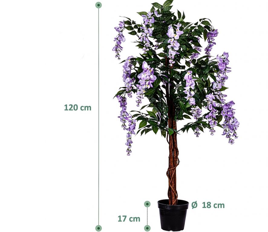 Prawdziwy drewniany bal wykonany z drewna palmowego dopełnia realistyczny wygląd Wisterii. Sztuczne drzewko jest dostarczane w czarnej doniczce, którą z łatwością można umieścić w dowolnej, ozdobnej doniczce.