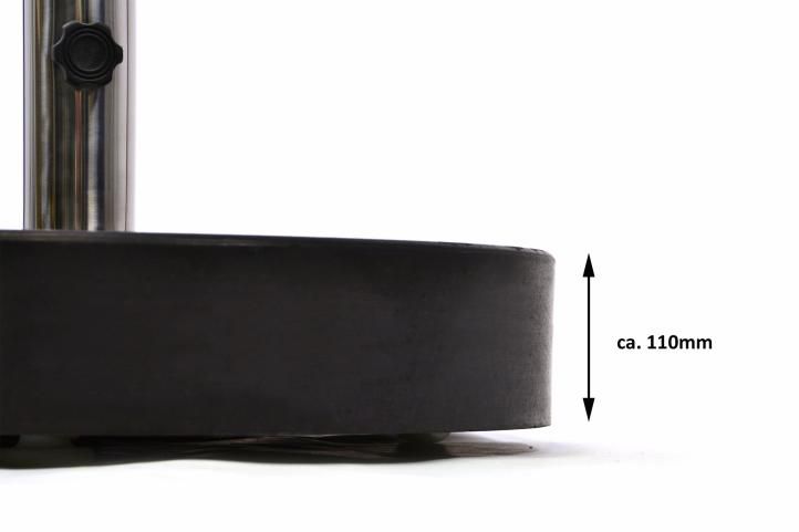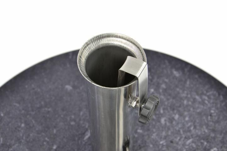 Masywny i bardzo ciężki stojak na granitowe parasole z połączeniem stali nierdzewnej. Dzięki dodatkowym rolkom na spodzie i uchwytowi po jednej stronie krawędzi, nawet obsługa tej 60-kilogramowej podstawy nie będzie problemem. Podstawa przeznaczona jest do parasoli o średnicy do 5 m, a dzięki dwóm bocznym śrubom może być stosowana do parasoli z prętem o maksymalnej szerokości 50 mm.