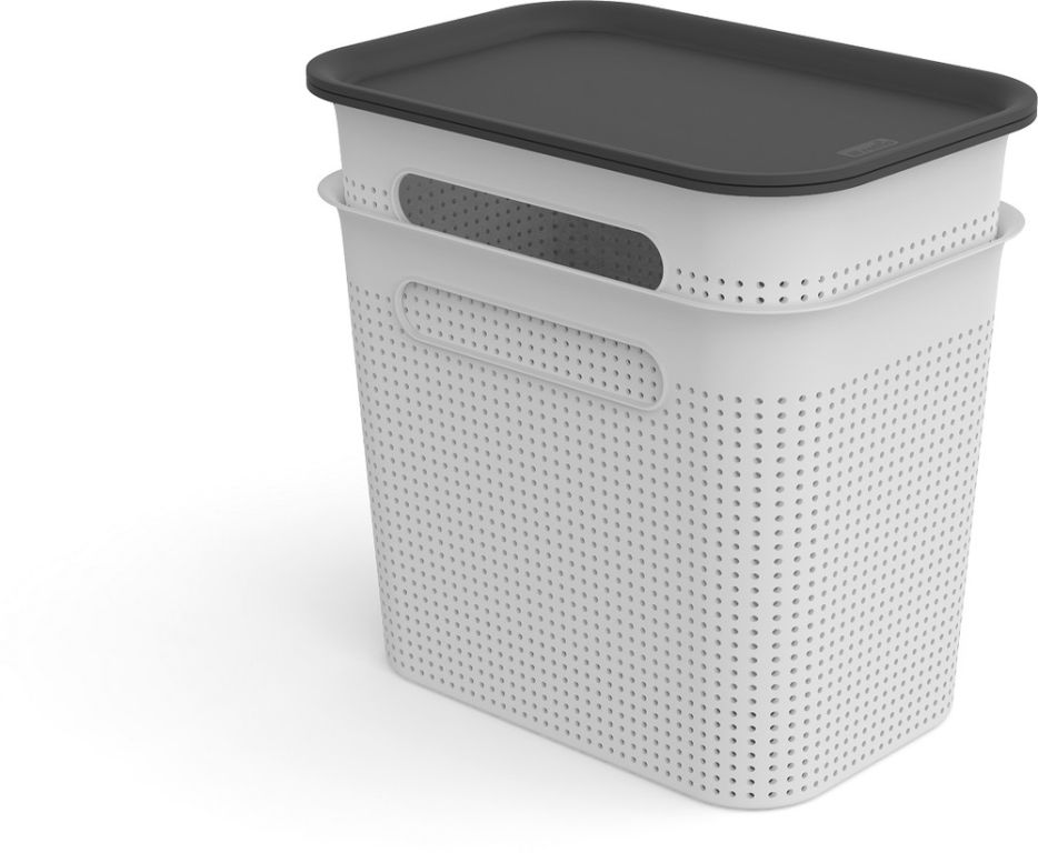 Pudełko do przechowywania z perforowaną strukturą. Wykonane z tworzywa sztucznego pochodzącego z recyklingu. Prosty i nowoczesny design. Zaokrąglone rogi. Jakość materiału i wykonania od szwajcarskiej marki Rotho.
