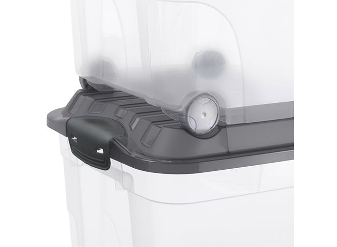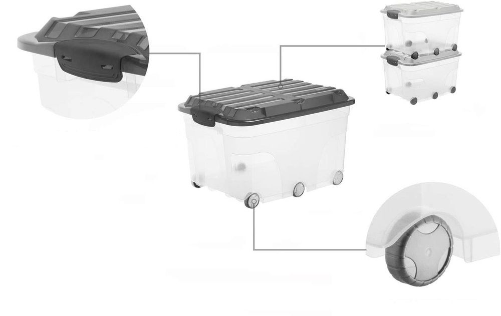Solidny plastikowy materiał gwarantuje trwałość, a kółka ułatwiają przesuwanie nawet ciężkiego pojemnika. Pokrywa z klipsem chroni zawartość, a możliwość sztaplowania pozwala zaoszczędzić miejsce.