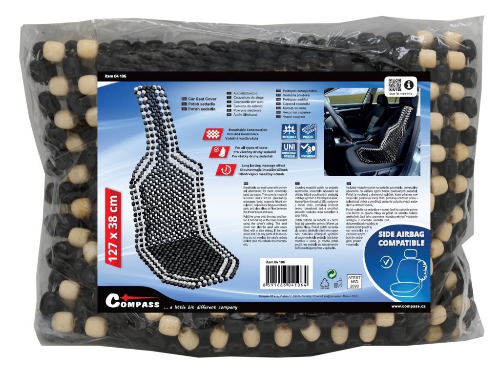 Pokrowiec wykonany jest z drewnianych kulek, które przyjemnie masują ciało, wspomagają krążenie krwi, pomagają zmniejszyć zmęczenie i ból pleców oraz umożliwiają przepływ powietrza pomiędzy siedzeniem a plecami kierowcy. Rozłóż pokrowiec na siedzeniu i przymocuj go u góry sznurkami za zagłówkiem. Jeżeli pokrowiec i/lub jakakolwiek część jego mocowania nie zachodzi na wyloty poduszek powietrznych w oparciu fotela, pokrowiec można również zastosować na siedzeniach z wbudowaną boczną poduszką powietrzną bezpośrednio w oparciu.