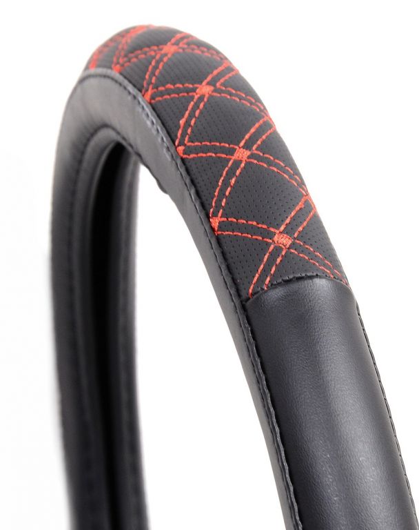 Ten uniwersalny pokrowiec idealnie dopasowuje się do kierownicy i skutecznie zapobiega ślizganiu się dłoni. To jeden z najczęstszych powodów, dla których kierowcy potrzebują pokrowca na kierownicę. Nie tylko chroni go przed zużyciem, ale także tłumi wibracje i nie przegrzewa się w bezpośrednim świetle słonecznym. Eleganckie wzornictwo dodatkowo podkreślają wzorzyste czerwone nitki.