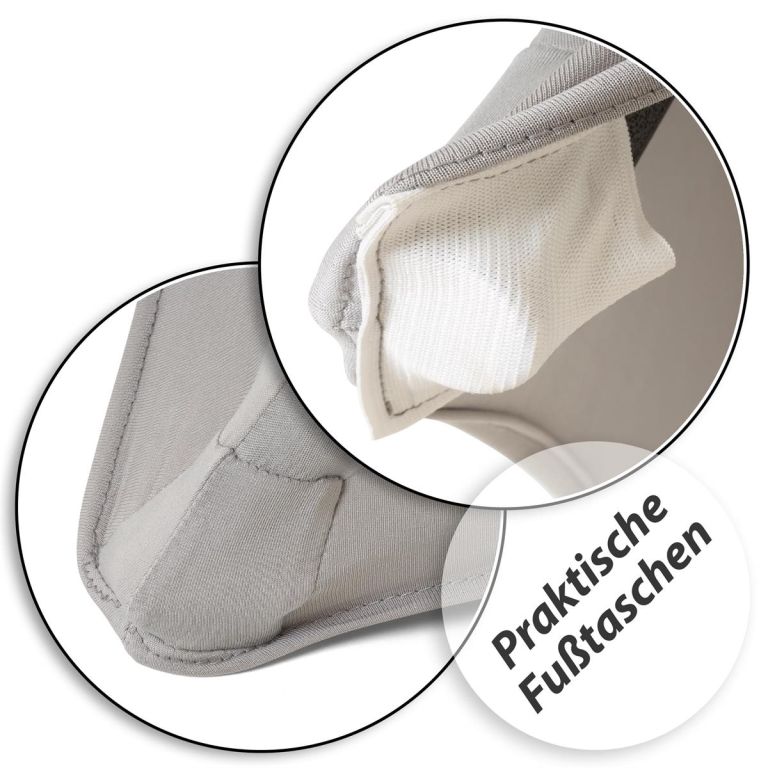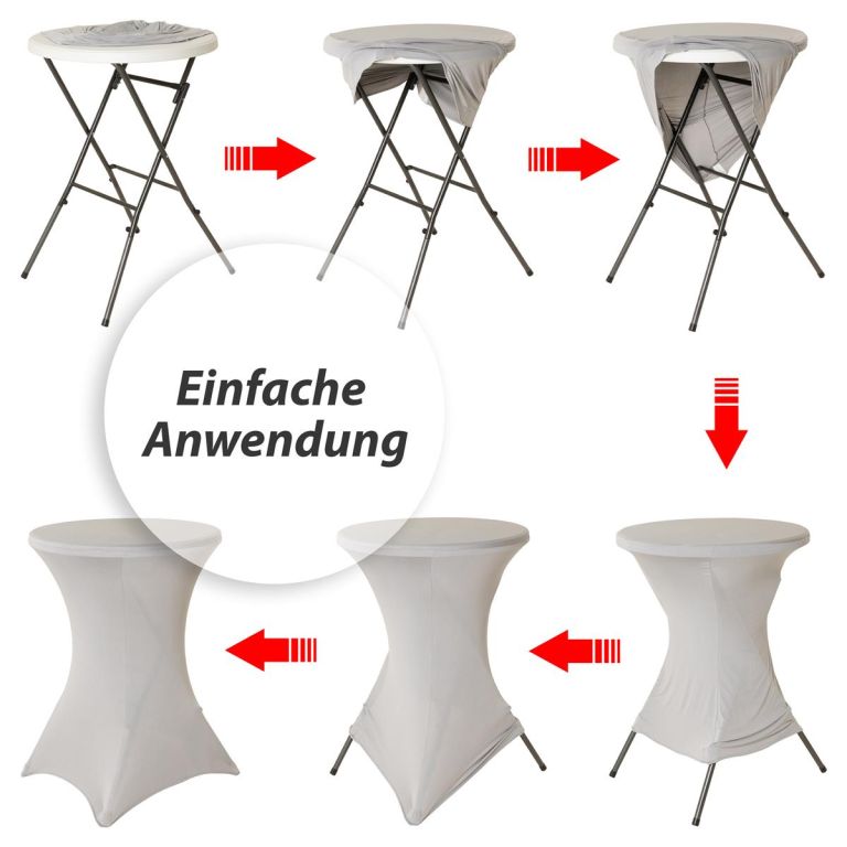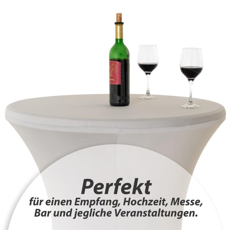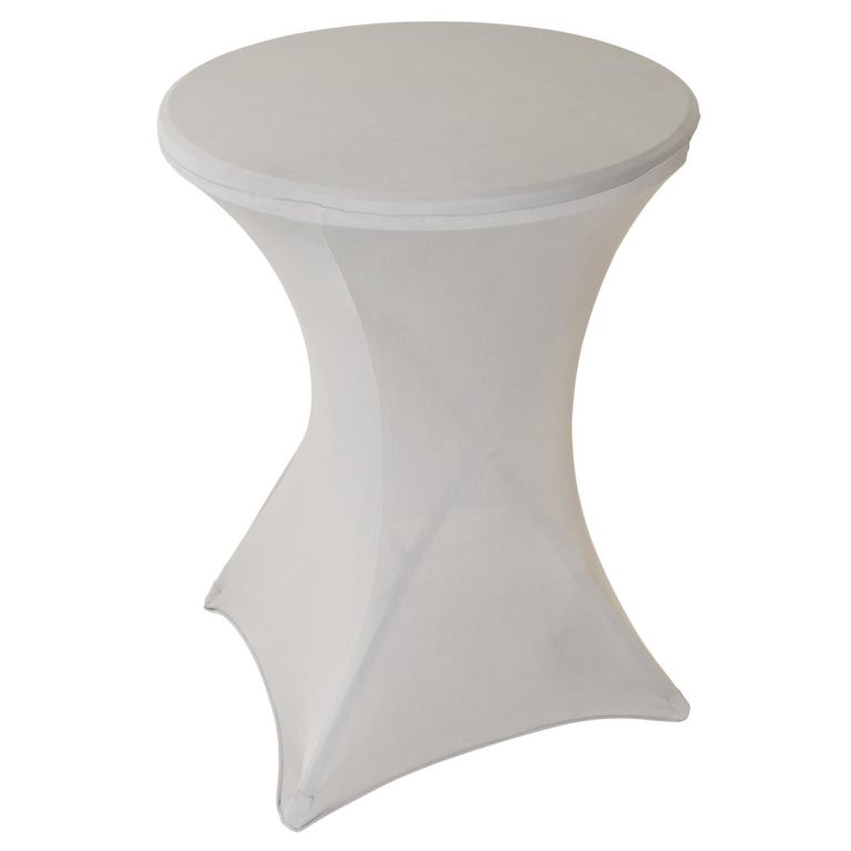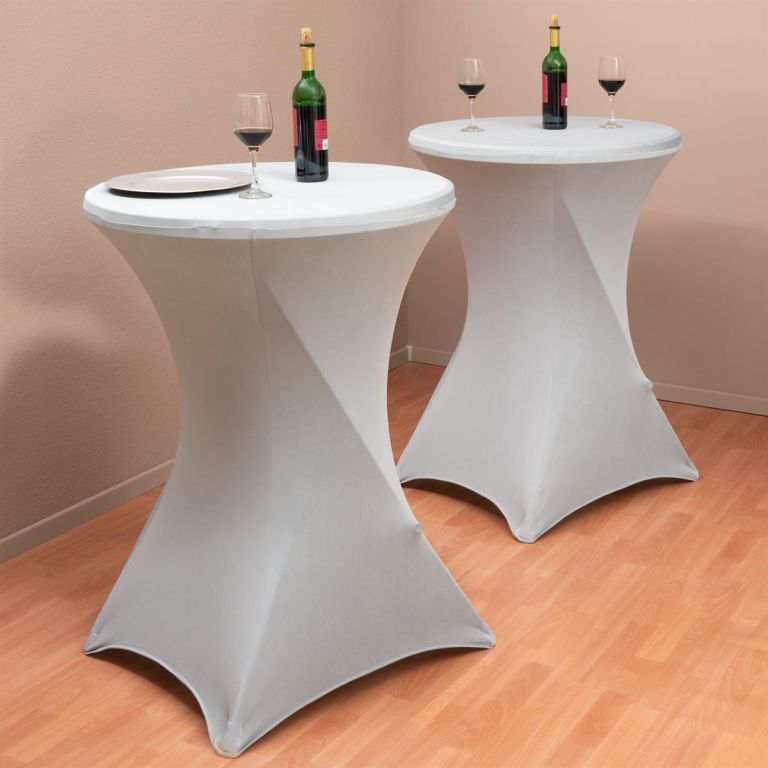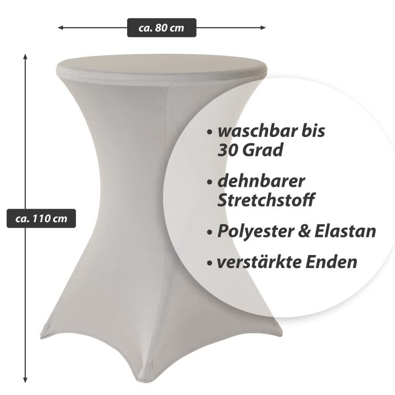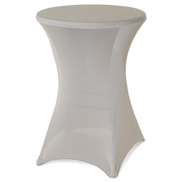Jasnoszary elastyczny pokrowiec na stół barowy 110 x 80 cm z poliestru i elastanu jest wielokrotnego użytku, można go prać i posiada wzmocnione końce.