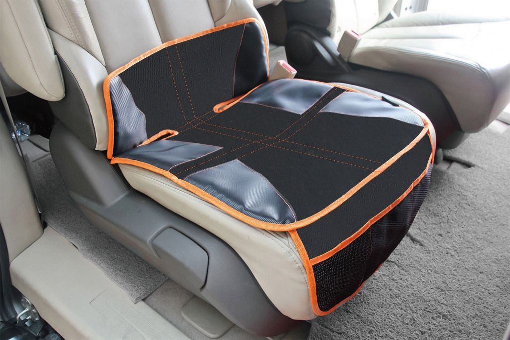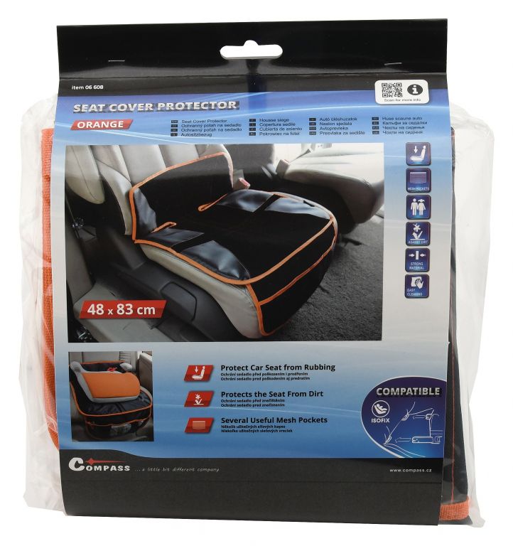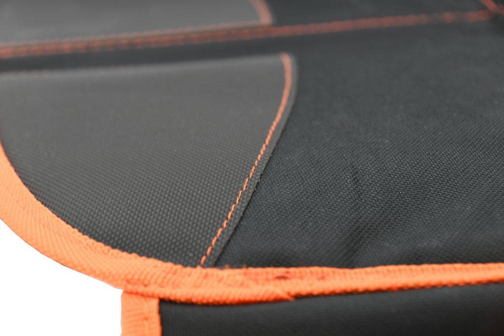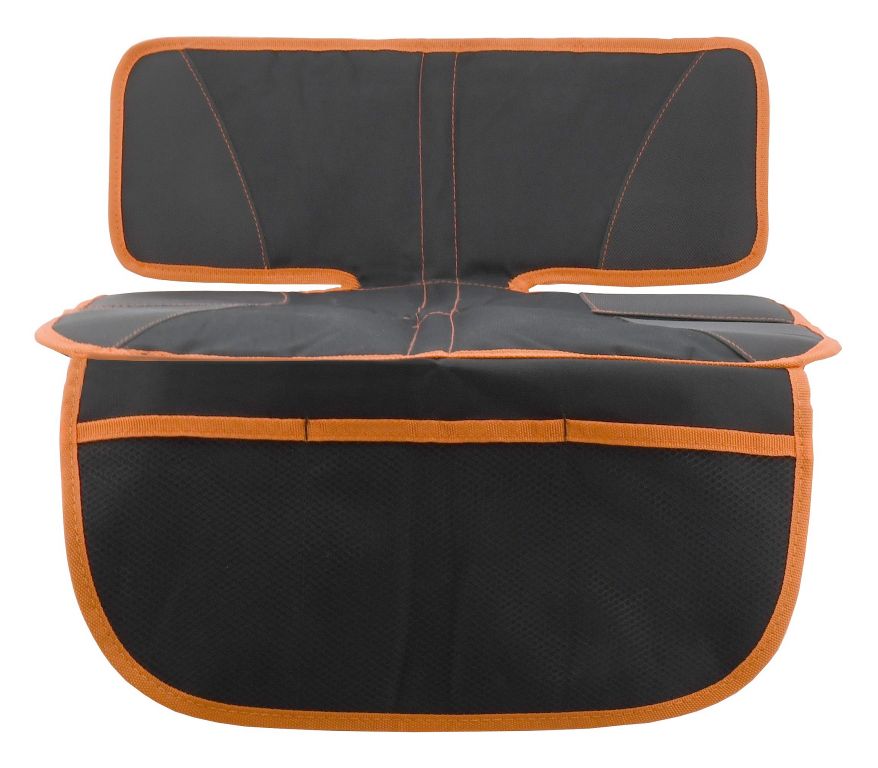 Praktyczny pokrowiec ochronny o wymiarach 48 x 83 cm wykonany z wytrzymałego poliestru, obszyty pomarańczową lamówką. Dolna warstwa jest oddychająca dzięki perforacji i jednocześnie utrzymuje pokrowiec na miejscu. Pokrowiec składa się z części tylnej oraz siedziska, które stosuje się szczególnie podczas korzystania z fotelika lub fotelika samochodowego, gdzie chroni oryginalne pokrowce przed uszkodzeniem i zabrudzeniem. Wyposażony jest również w praktyczny, przedni panel, na który naszyty jest system siateczkowych kieszonek, na różne potrzeby i rzeczy. Panel przedni chroni przód fotelika przed zabrudzeniem i uszkodzeniem.