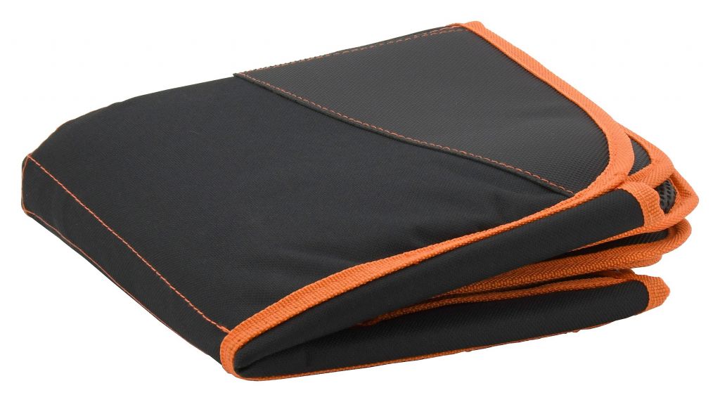 Praktyczny pokrowiec ochronny o wymiarach 48 x 83 cm wykonany z wytrzymałego poliestru, obszyty pomarańczową lamówką.