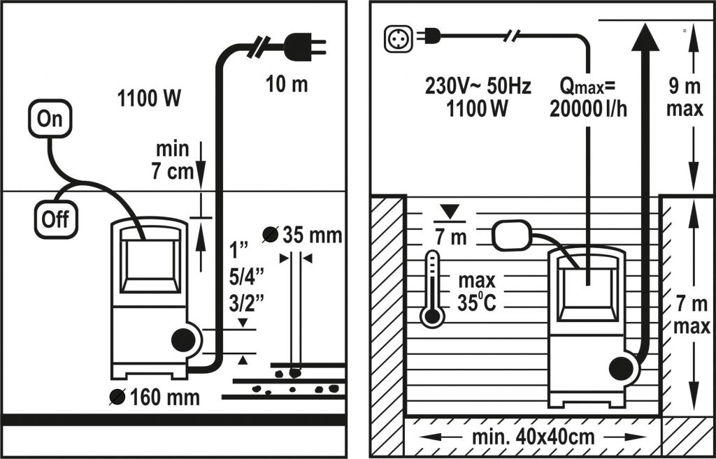 Korpus pompy jest wykonany ze stali nierdzewnej, aby chronić urządzenie przed wpływami zewnętrznymi. Jest również wyposażony w wyłącznik pływakowy, który uniemożliwia pompie pracę w stanie „suchym". Do podłączenia do sieci pompa jest wyposażona w kabel o długości 10 m.