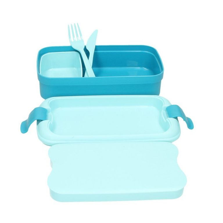 Podróżne plastikowe pudełko na przekąski z widelcem i nożem. W pudełku znajduje się specjalna komora, którą można łatwo wyjąć