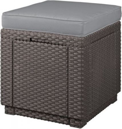 Pufa w kształcie sześcianu wyposażona w schowek pod siedzeniem. Wyprodukowana z formowanego tworzywa sztucznego imitującego płaską wiklinę w kolorze grafit + szare poduszki. Nadaje się do używania w domu i w plenerzeZaletą jest długa żywotność, trwałość i łatwość konserwacji materiału.