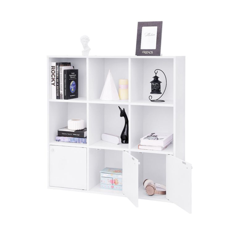 Funkcjonalny regał z 9 przegródkami i drzwiczkami. Idealny do salonu, pokoju dziecięcego czy biura.