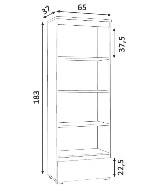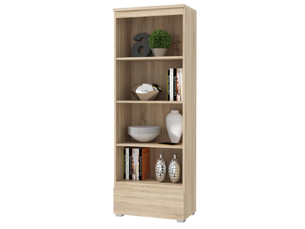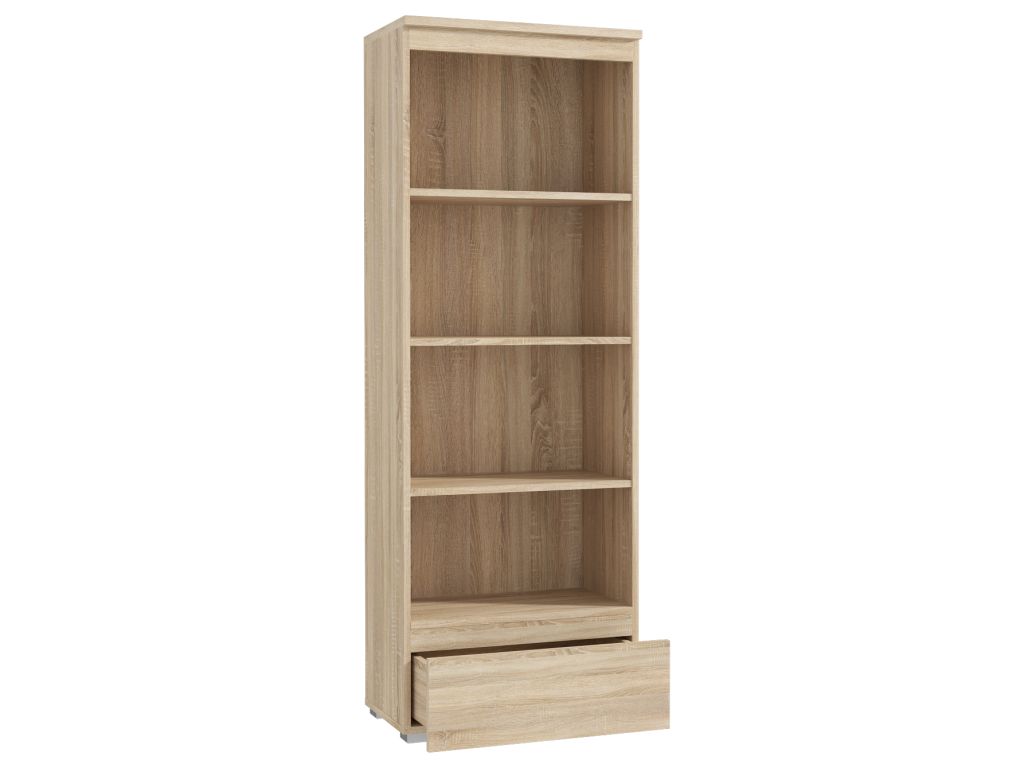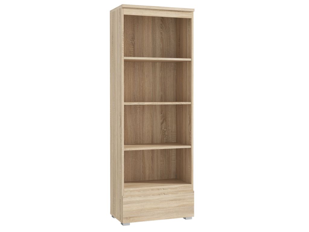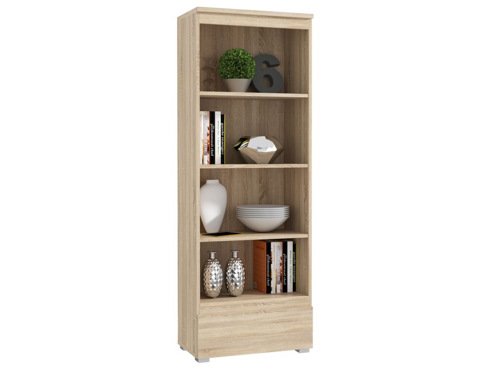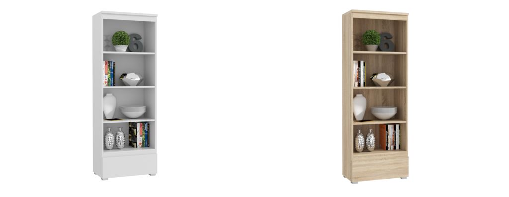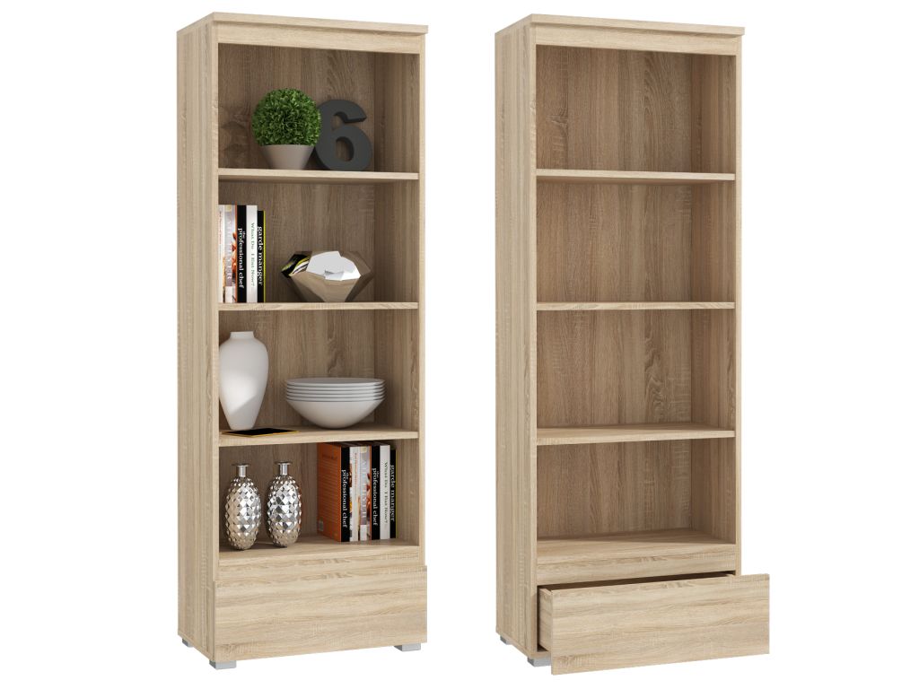 Wysoka szafa regałowa w dekorze dąb sonoma to idealny wybór dla osób, które szukają połączenia nowoczesnego designu z praktycznym wykorzystaniem przestrzeni. Cztery otwarte półki oferują dużo miejsca na książki, dekoracje czy materiały biurowe. Głęboka, wysuwana szuflada w dolnej części pomieści wszystko, co warto mieć pod ręką, ale schowane – od dokumentów po codzienne drobiazgi.