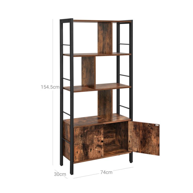 Wyjątkowe połączenie rustykalnego brązu i czarnej stali wnosi do każdego wnętrza niepowtarzalny, industrialny klimat. Regał z czterema otwartymi półkami i zamykaną szafką pozwala wyeksponować ulubione książki, dekoracje czy rośliny, a jednocześnie ukryć to, co nie powinno być na widoku. Asymetryczny układ półek dodaje charakteru i oryginalności, czyniąc mebel centralnym punktem aranżacji.