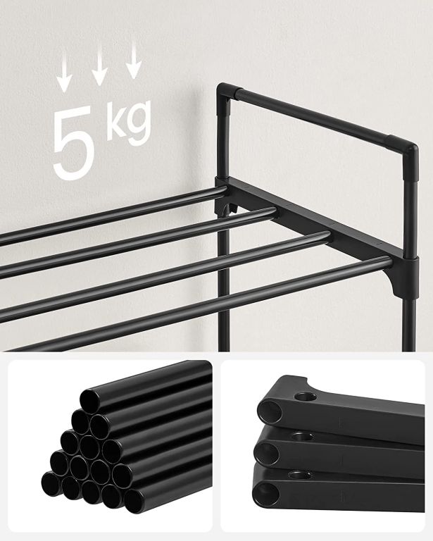 Stwórz uporządkowaną przestrzeń w swoim domu dzięki temu funkcjonalnemu regałowi na buty. Minimalistyczny, czarny wygląd sprawdzi się w każdym wnętrzu i pozwoli na wygodne przechowywanie nawet 15 par obuwia.