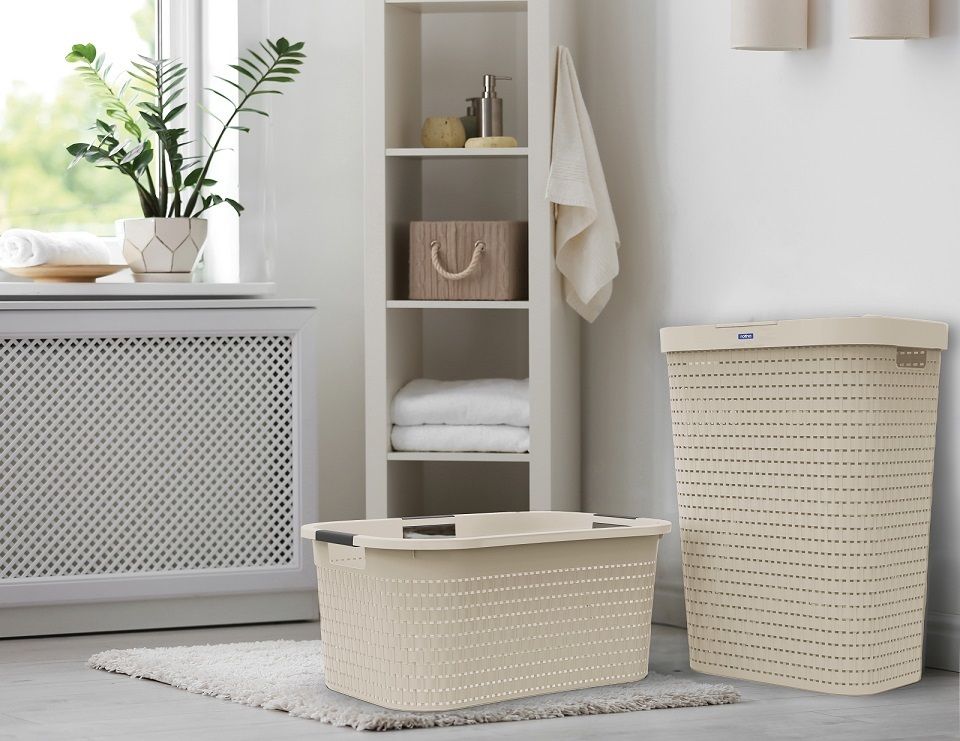Plastikowy kosz na bieliznę w stylu rattanowego tkania nadaje się do każdej łazienki swoim wyglądem.