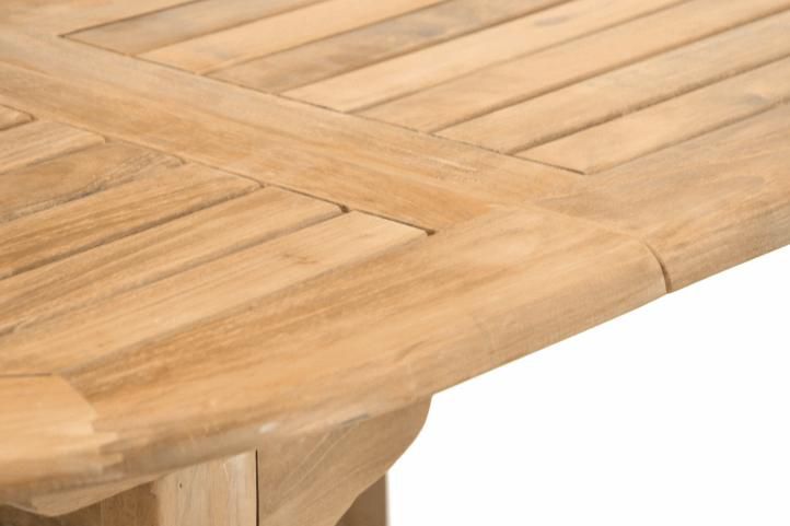 Solidny, masywny stół z drewna tekowego o prostym, estetycznym wyglądzie. Będzie pasował do każdego pomieszczenia. Po rozłożeniu stołu można zamieścić parasol na środku. Teak to wyjątkowe drewno egzotyczne, które dzięki dużej zawartości naturalnych olejów i kwasu krzemowego charakteryzuje się bardzo wysoką trwałością, szczególnie w wilgotnym i nieprzyjaznym innym gatunkom drewna środowisku. Jest odporne na działanie czynników atmosferycznych oraz grzybów.