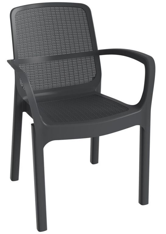 Plastikowe krzesło ogrodowe z podłokietnikami jest bardzo lekkie, ale także bardzo wytrzymałe i stabilne. Oparcie i siedzisko są wykonane z popularnej imitacji płótna. Krzesło można sztaplować, co ułatwia jego przechowywanie. Zastosowany materiał to mocny plastik z recyklingu. Krzesło jest odporne na warunki atmosferyczne i promieniowanie UV oraz bardzo łatwe w utrzymaniu. Dzięki grafitowemu wykończeniu może stanowić uzupełnienie wielu stołów lub zestawów w tym kolorze.