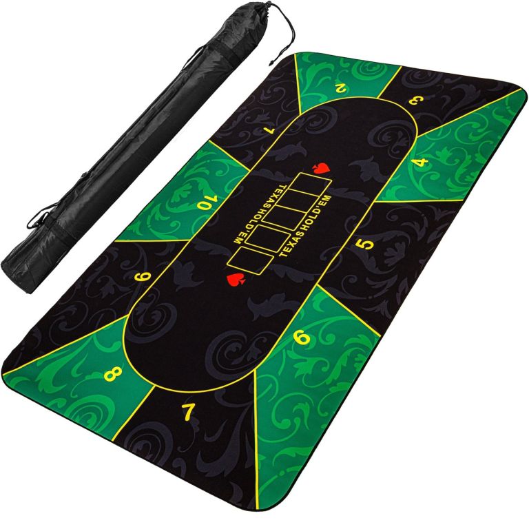 Mata do pokera jest odpowiednia dla maksymalnie 10 graczy. Przód jest wykonany z poliamidu, a materiał jest przyjemnie miękki i gładki w dotyku (podobnie jak podkładka pod mysz). Tył wykonany z antypoślizgowej gumy naturalnej - gumowa powłoka zapobiega ślizganiu się ochraniacza. Podkładkę można zwinąć, aby zaoszczędzić miejsce i można ją łatwo zabrać w dowolne miejsce dzięki dołączonej torbie.