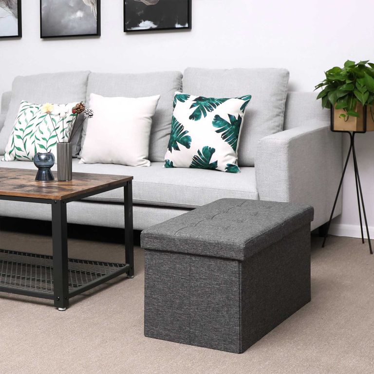 Solidna płyta MDF klasy E1 i udźwig 300 kg zapewniają trwałość i bezpieczeństwo. Ciemnoszary pokrowiec z lnu jest miękki i elegancki. Montaż trwa chwilę – trzy elementy, jasna instrukcja, bez narzędzi.