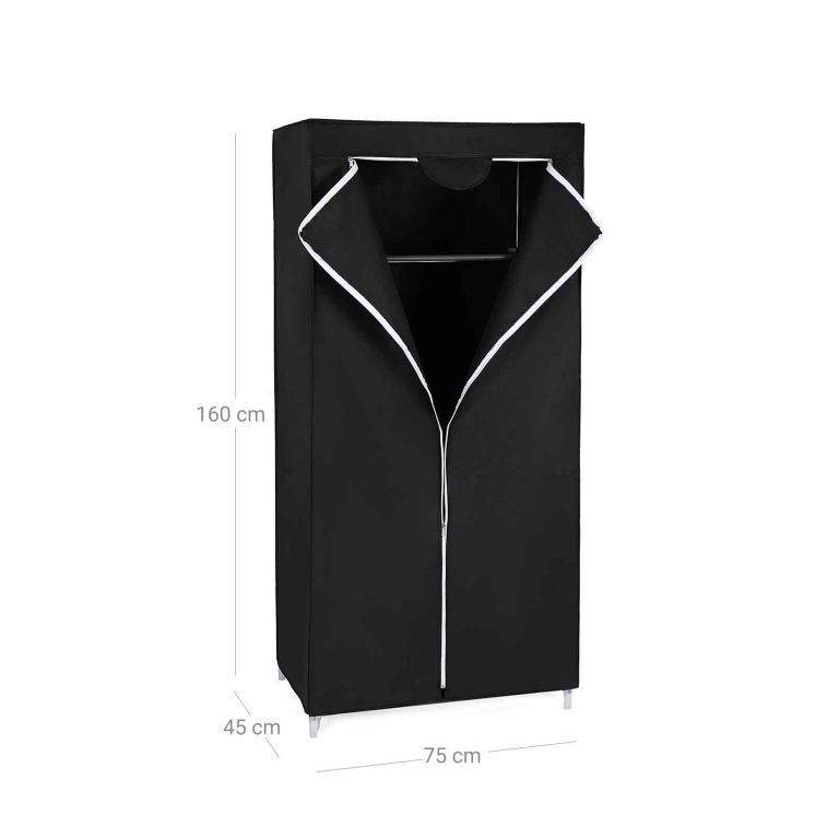 Praktyczna składana szafa tekstylna w czerni, chroni ubrania przed kurzem i oszczędza miejsce.